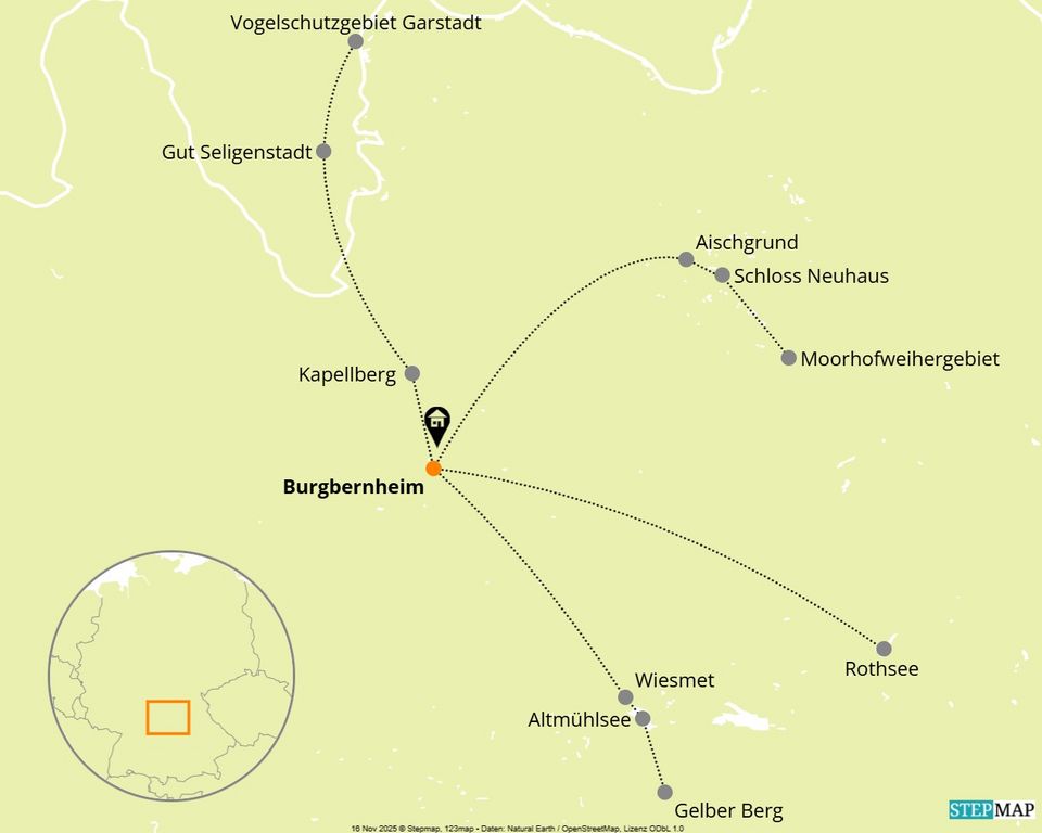 Wir starten den Tag gemütlich nach dem Frühstück. Auf dem Weg zu unserer Ziellocation machen wir noch kurz bei einem Bäcker halt, um unsere Tagesverpflegung mitzunehmen. Heute haben wir keine Eile, denn vom Beobachtungsturm auf der Vogelinsel im Altmühlsee aus ist die Sicht abends am besten. Der Altmühlsee mit seiner berühmt-berüchtigten Vogelinsel gilt zu Recht als das beste Vogelbeobachtungsgebiet Frankens. Über 300 Vogelarten wurden hier bereits nachgewiesen. Auf dem Beobachtungsturm geben sich Birder aus ganz Deutschland die sprichwörtliche Klinke in die Hand. Bevor wir den Tag mit einem Besuch dieser legendären Birdinglocation abschließen, werfen wir einen Blick in eines der besten bayerischen Wiesenbrütergebiete, das Wiesmet. Hier brüten Arten wie Uferschnepfe, Großer Brachvogel, Rotschenkel und Bekassine und während der Zugzeiten ist das Gebiet für Greifvogelarten wie den Merlin oder Weihen interessant. Danach steuern wir den Gelben Berg, eine 628 m hohe Erhebung im Hahnenkamm, einem Ausläufer der Fränkischen Alb, an. Nach kurzem Anstieg (Strecke ca. 800 m; ca. 30 Höhenmeter einfach) bietet sich uns vom Gipfel aus nicht nur ein schöner Ausblick über das Vorland des Altmühlsees - der Gelbe Berg ist auch zur Beobachtung des herbstlichen Vogelzugs interessant (z.B. für Arten wie Heidelerche, Ringdrossel oder verschiedene Pieper). Im Anschluss machen wir uns wieder auf in Richtung Altmühlsee. Nach einem kurzen Check der Vögel auf der offenen Seefläche fahren wir zur Vogelinsel (Laufstrecke hier ca. 2 km). Gegen Abend machen wir uns auf den Rückweg nach Burgbernheim, wo wir zu Abend essen.
